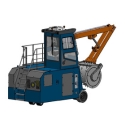 This compactor is powered by electric motors and offers access to a control cabin via a rear staircase. Movements are controlled by a hydraulic system. An electro-hydraulic unit transmits energy to a distributor, operated by the cabin user to activate arms and perform the compaction cycle as well as chassis lifting. Movement and roller rotation are powered by two electric gear motors.