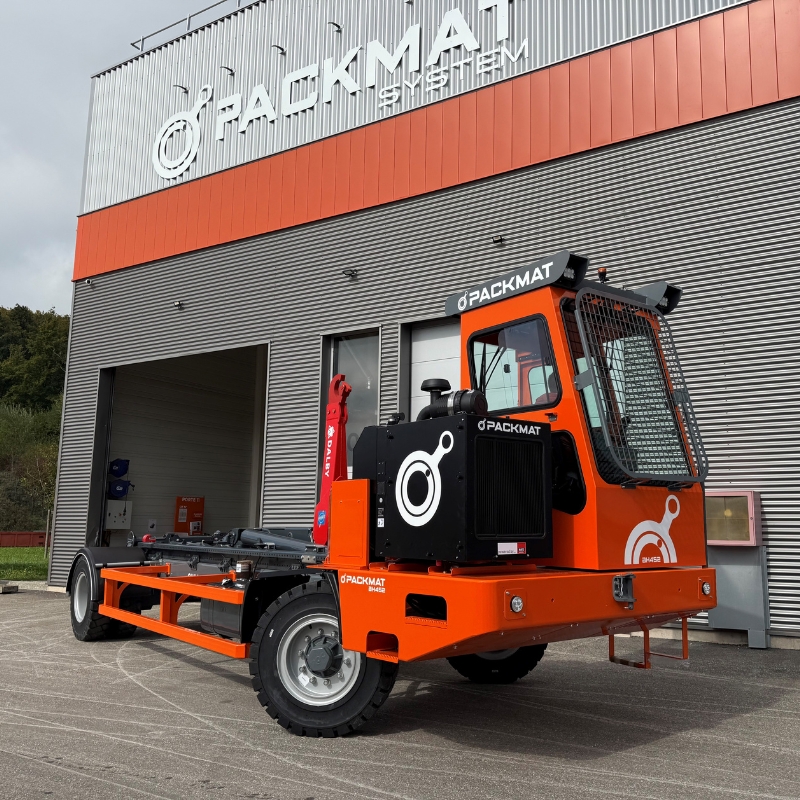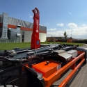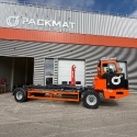This carrier vehicle is powered by a diesel engine and features side access to the cabin via three steps. Movements and driving are powered by a hydraulic circuit. A pump driven by the diesel engine transfers energy to the wheel motors for movement. A second pump directs energy to a distributor, which operates the steering and lifting arm for loading and unloading bins of up to 16 tons.